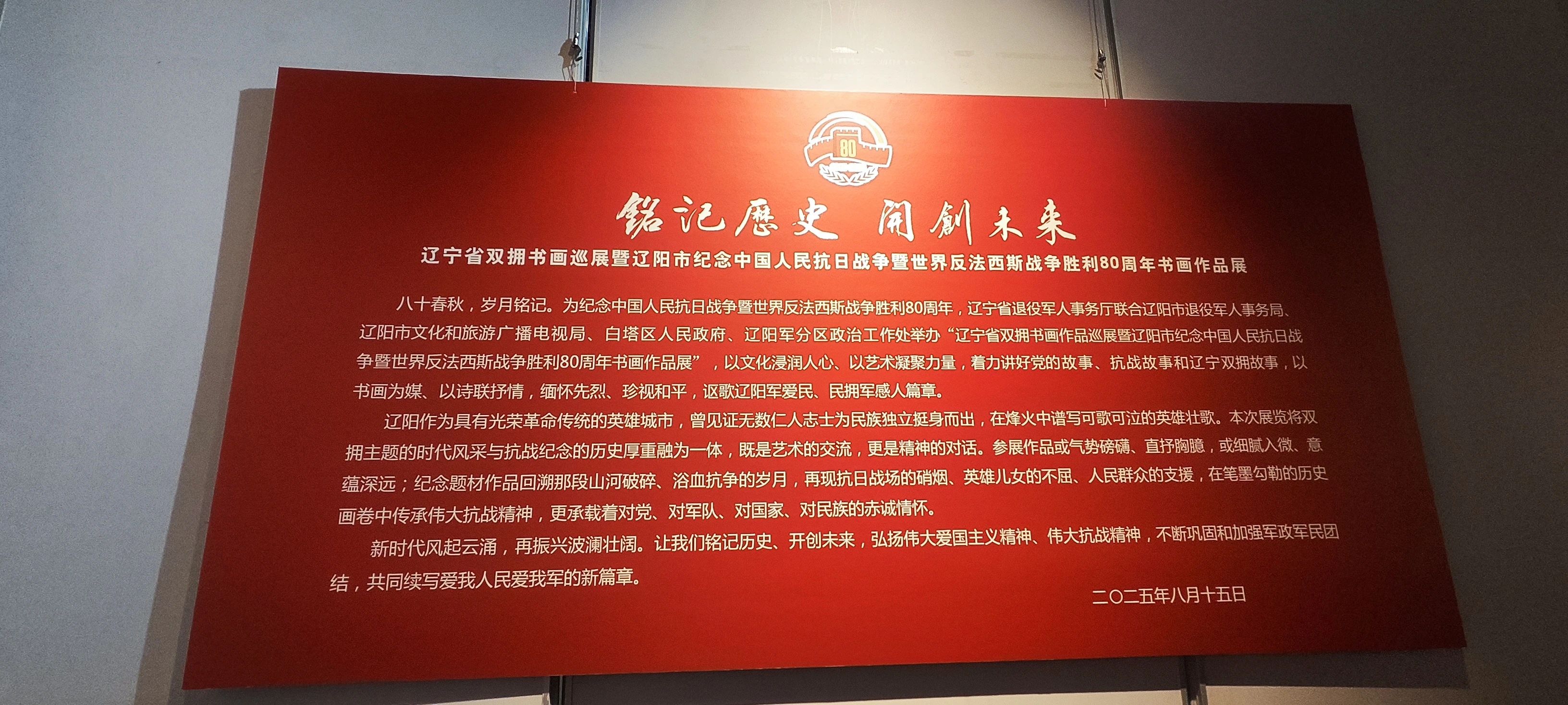 遼寧省雙擁書畫巡展暨遼陽市紀(jì)念中國(guó)人民抗日戰(zhàn)爭(zhēng)暨世界反法西斯戰(zhàn)爭(zhēng)勝利80周年書畫作品展日前在遼陽博物館開展,共展出遼寧省雙擁書畫作品展獲獎(jiǎng)及名家作品79幅,遼陽市退役軍人書畫愛好者及社會(huì)各界書法、美術(shù)佳作120余幅,涵蓋了書法、國(guó)畫、油畫等多種藝術(shù)形式。