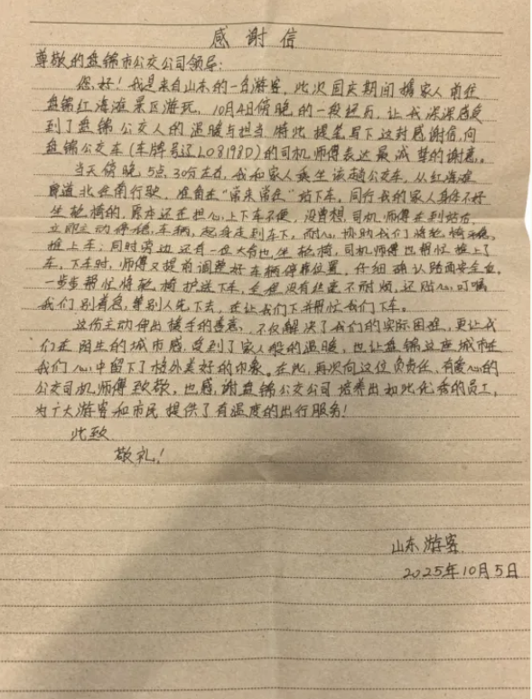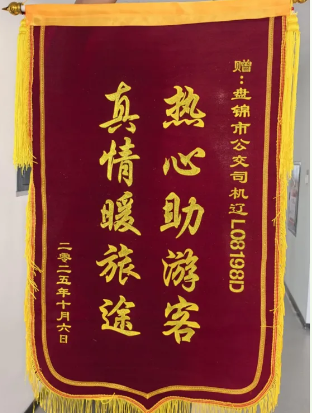 近日,盤錦客運(yùn)公交集團(tuán)收到一份跨越600公里的“雙節(jié)禮物”,一面寫著“熱心助游客 真情暖旅途”的錦旗、一封手寫的感謝信,落款是“山東游客”。字里行間,記錄著10月4日傍晚發(fā)生在10路公交車上的暖心一幕。